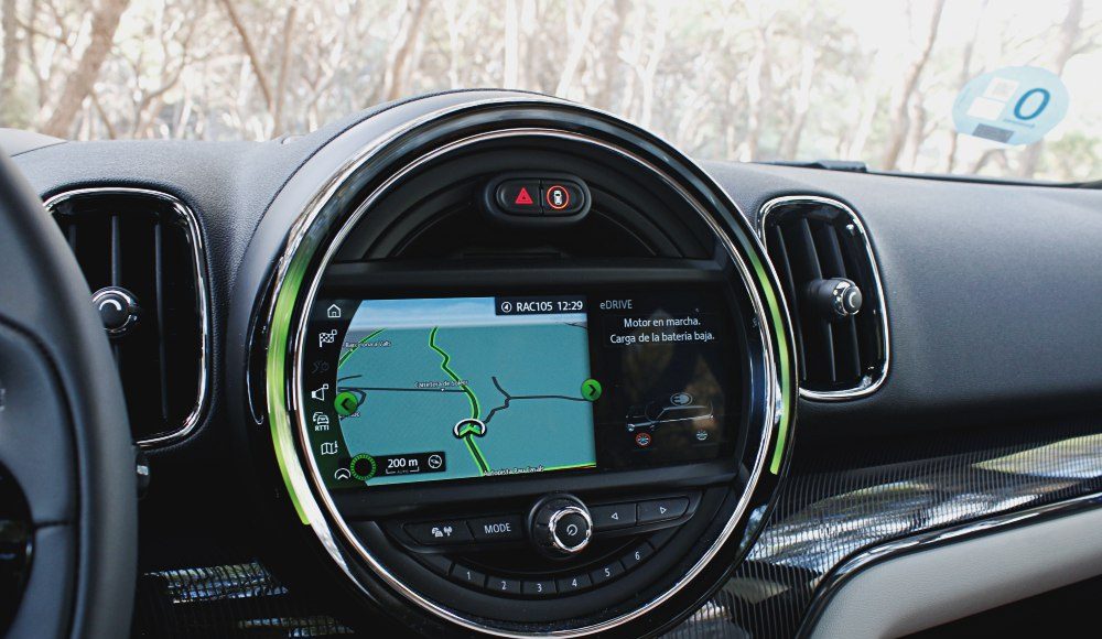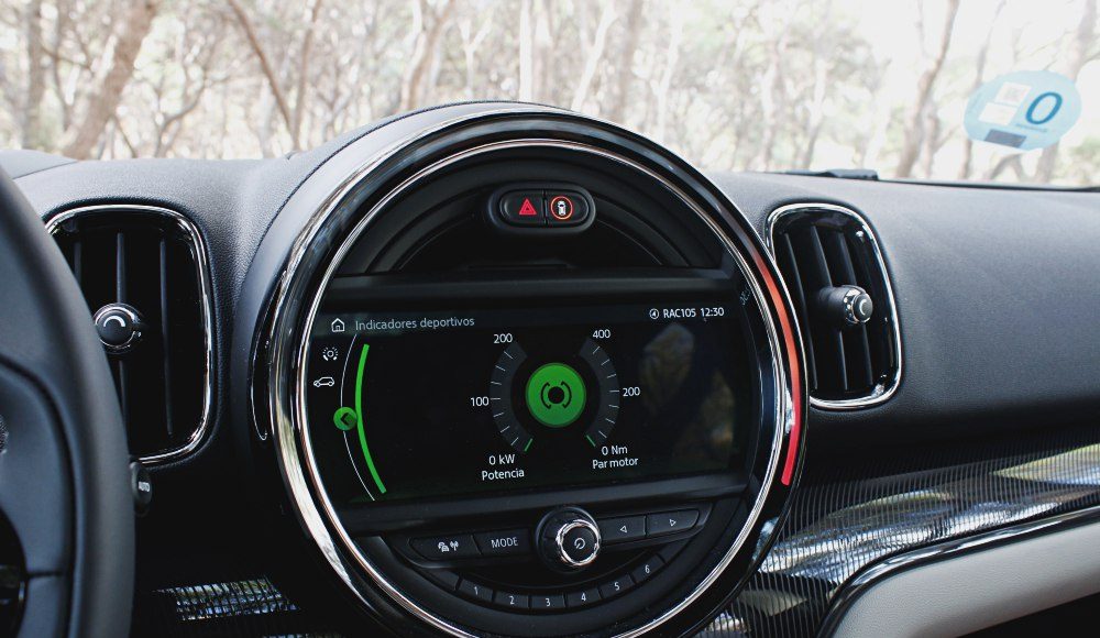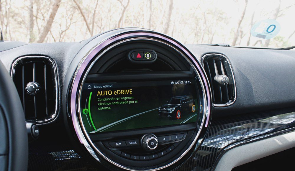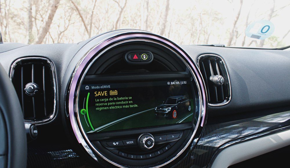 En el interior son pocos los detalles que diferencian al SE de un Countryman convencional, entre ellos el botón de START, que ahora es de color amarillo, así como por el selector que encontramos a su izquierda, desde el que se activan los diferentes modos de conducción híbridos, o el indicador de uso y varga de la betería que encontramos en lugar del cuenta revoluciones, así como por las grafías que aparecen en la pantalla del centro de la consola donde podemos ver representado el flujo de energía.