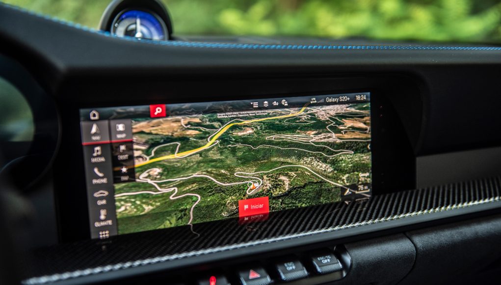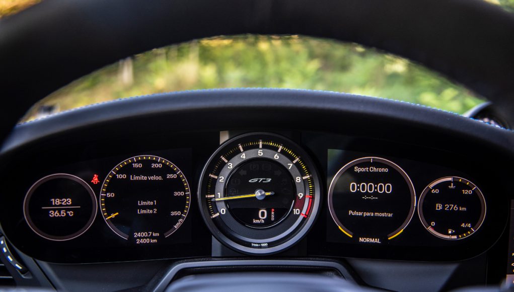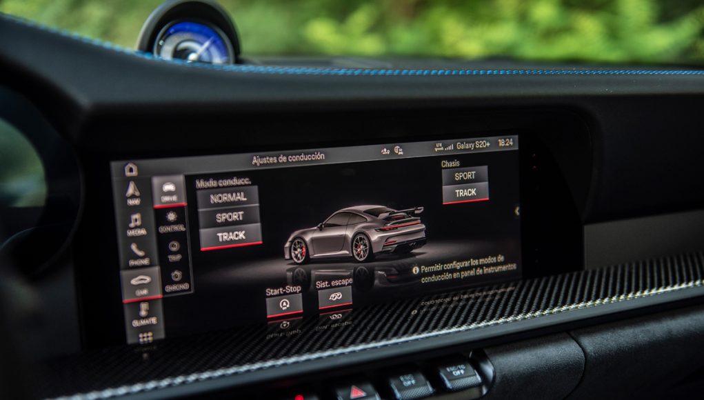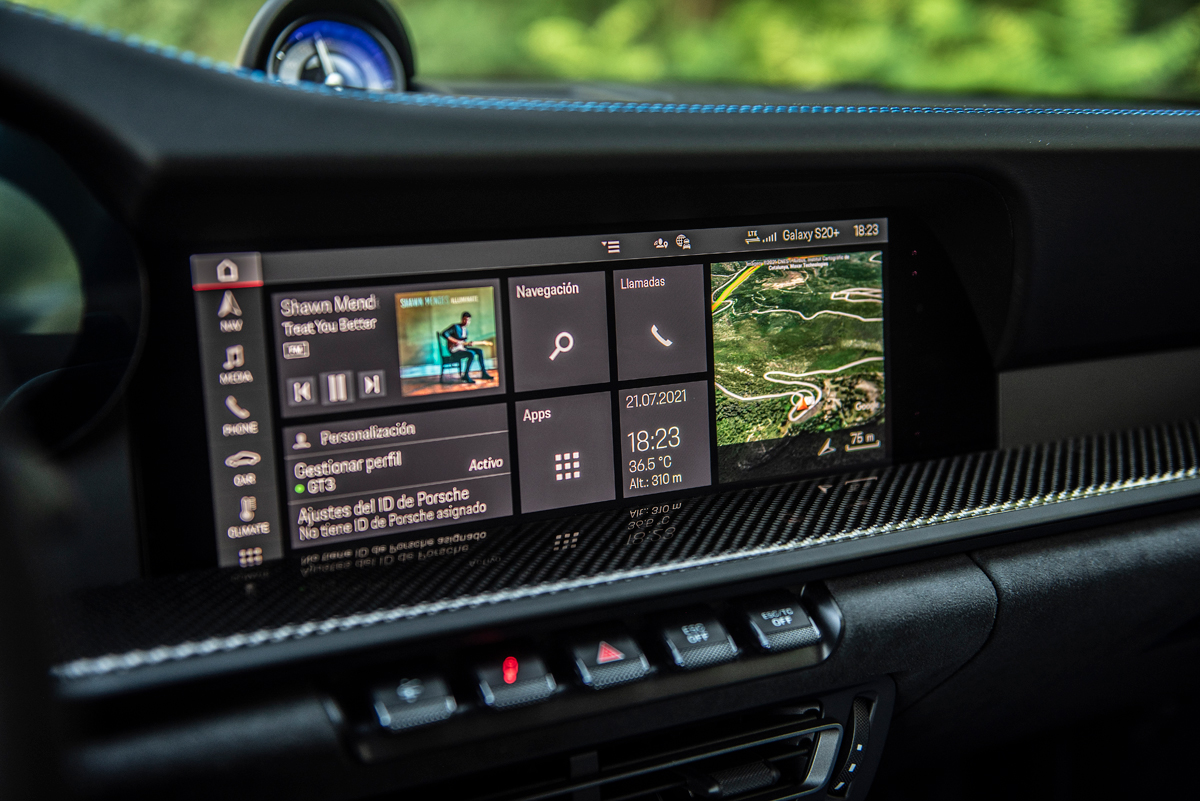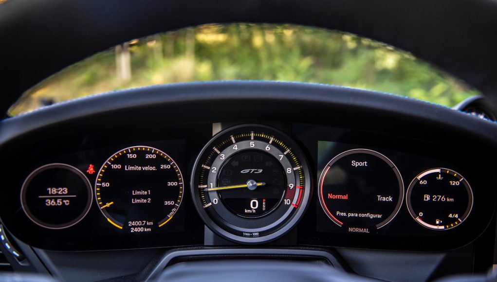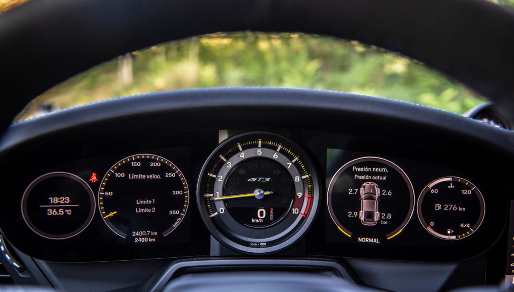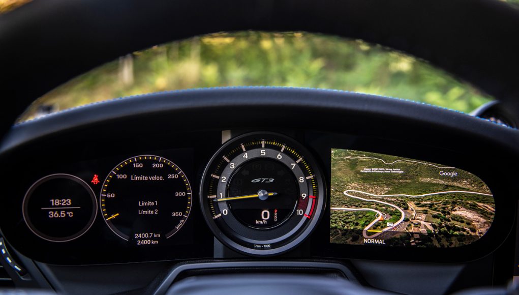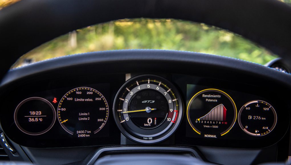 Tras el volante multifunción que incorpora las levas en la parte trasera, así como el mando giratorio con el que seleccionamos los diferentes modos de conducción (Normal, Sport y Track), encontramos un cuadro semi-digital, que dispone las 5 míticas esferas, representadas ahora en una pantalla TFT, a excepción de la central, que en esta versión está fabricada en titanio y es el lugar que ocupa el cuentarrevoluciones que es analógico. Sin duda uno de los elementos informativos más importantes del GT3. Las esferas lateras son personalizables en cuanto a la información que quieras tener a la vista, pudiendo en las dos de la derecha proyectar el sistema de la navegación.