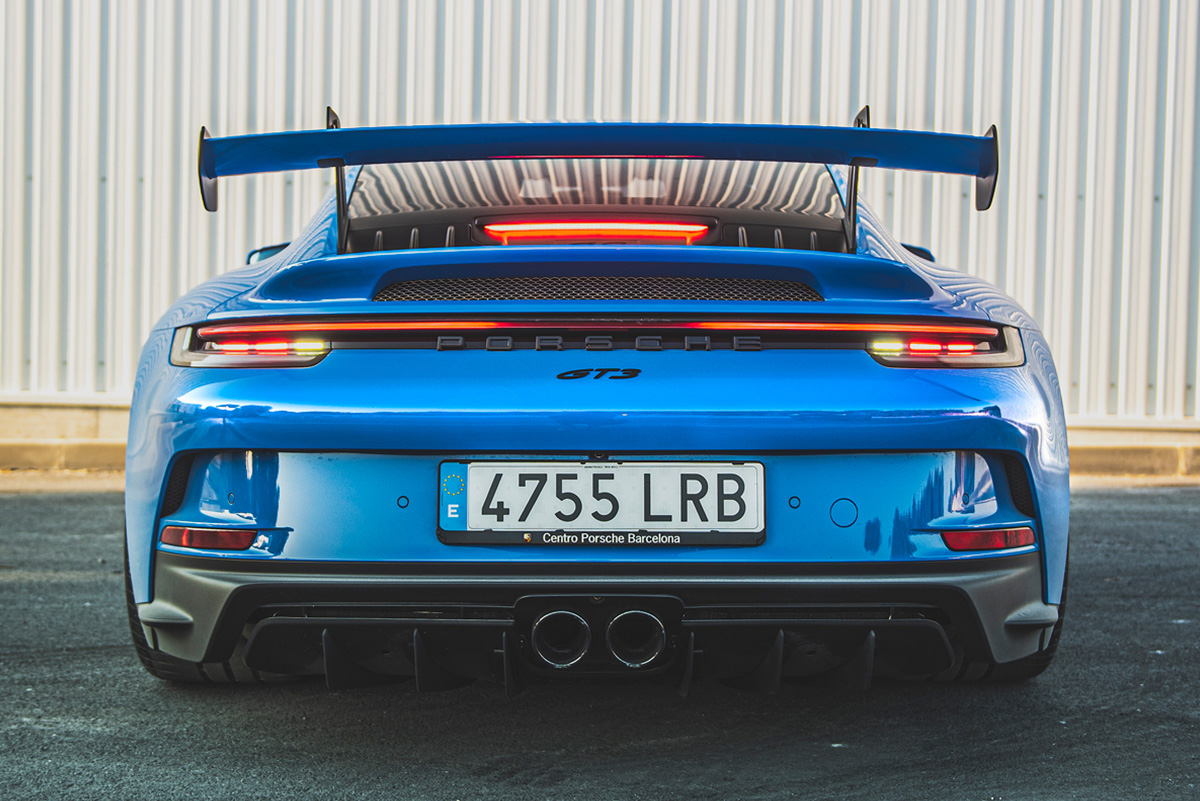 A nivel estético, es fácil diferenciar a un GT3 de cualquier otro 911, incluso de la versión Turbo S, con elementos exteriroes entre los que encontramos un paragolpes sobredimensionado que cuenta con dos entradas específicas encargadas de enviar aire frío a los frenos, así como por las dos entradas del capó delantero, el nuevo difusor trasero o el alerón.