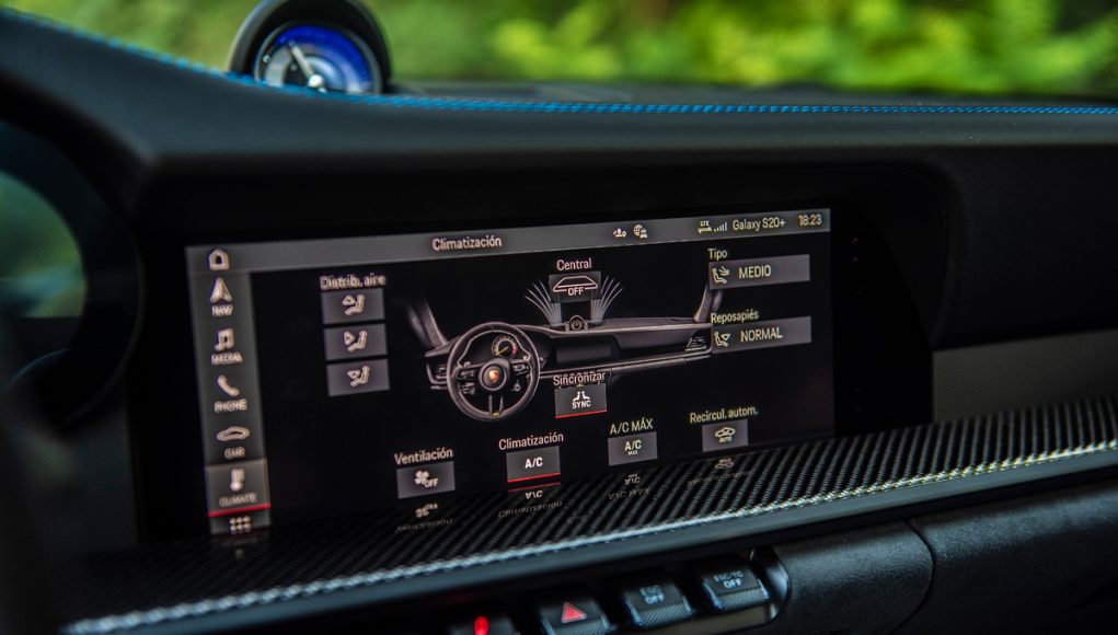 En la consola central encontramos una pantalla táctil de 10,9 pulgadas, que incluye a la última generación del sistema Porsche Communication Management (PCM), siendo ahora mucho más clara la entrega de información, así como la navegación a través de los diferentes menús que son configurables de forma individual. Aquí disponemos del sistema de navegación, sistema de infotaiment y diversos parámetros de configuración del coche, como los modos de conducción y que además es compatible con Apple CarPlay.