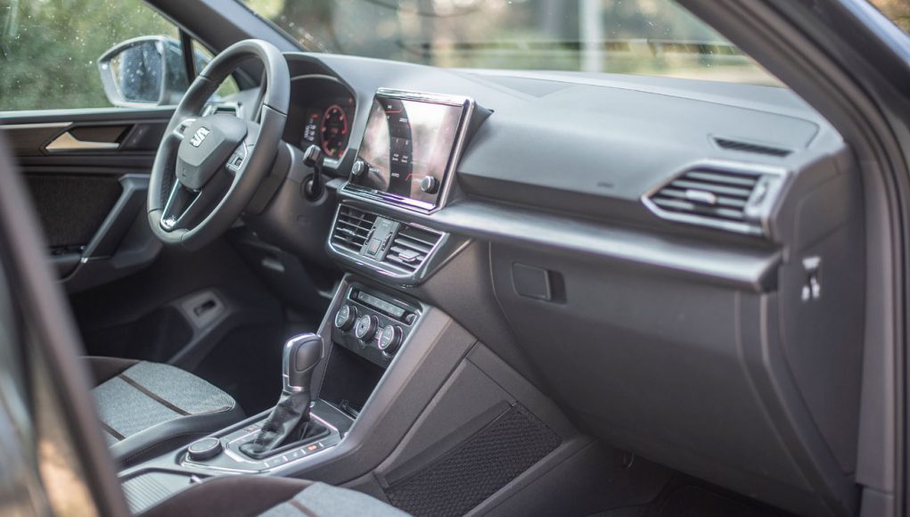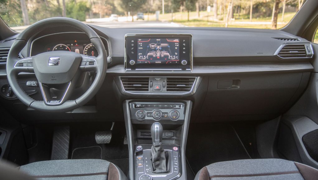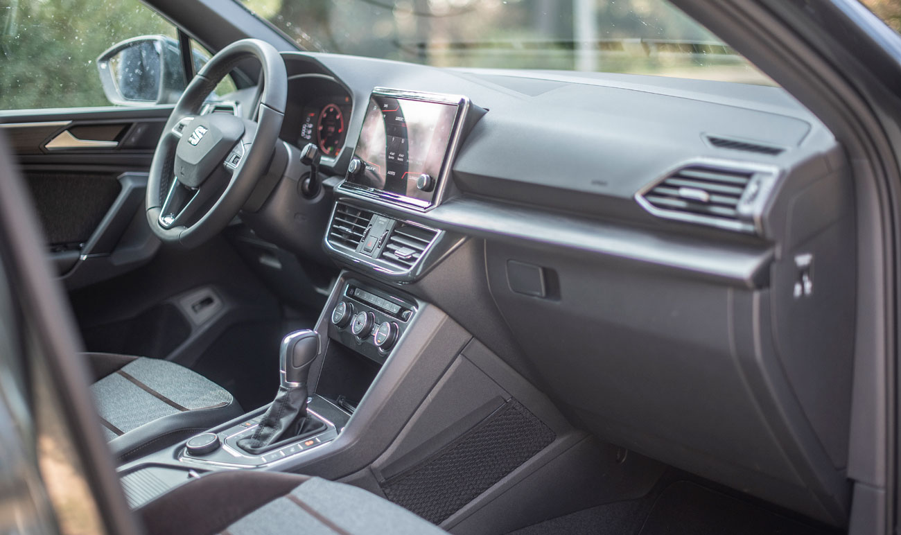 Cuando accedes al interior del Tarraco, enseguida se aprecia que el empaque premium de este SUV no solo es visible en su exterior, sino que SEAT ha cuidado el habitáculo para ofrecer lo que esperas en un coche como este. Los asientos, tapizados en tela en combinación con la Alcántara, ofrecen un alto grado de confort, además recogen el cuerpo muy bien, incluso en los apoyos laterales a la hora de conducir por zonas reviradas. La posición de conducción está muy buen cuidada, pues te ofrece una vista panorámica de toda la delantera del coche, en la que el pilar A apenas molesta, sobre todo en los giros más cerrados.