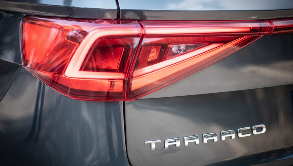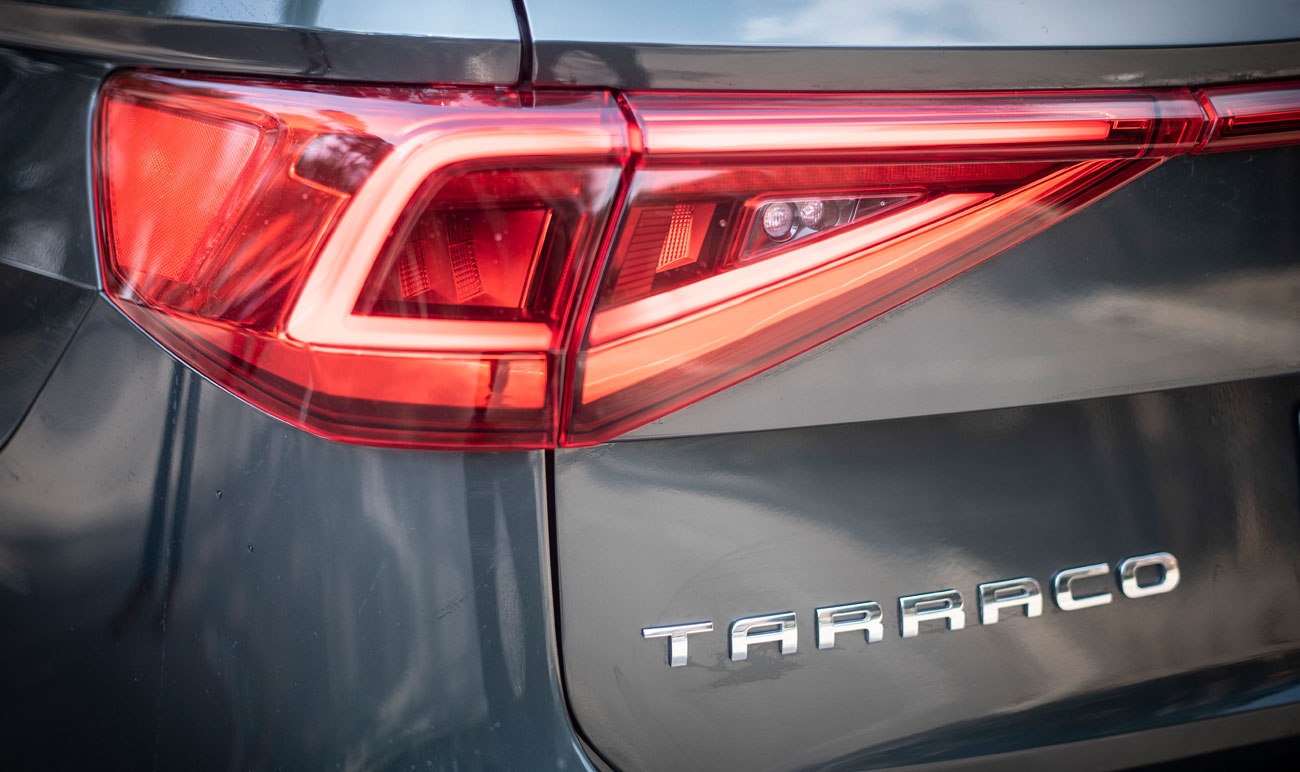 La vista lateral del Tarraco, es la que da y evidencia más si cabe su longitud, en la que vemos unos pasos de rueda sobredimensionados, para dar cabidas a las preciosas llantas de aleación SUPREME de 20” (opcionales) calzadas con unos neumáticos en medida 235/45/20, que dejan entre ver el sistema de frenado compuesto por unos discos de acero de 340 mm, así como una nervadura de media cintura que recorre todo el lateral del coche y que ensalza más si cabe su diseño. En la zaga, muy a la moda, ofrece unos pilotos LED de luces dinámicas, que se unen mediante una tira reflectante, que dibuja por la noche una perfecta forma lumínica realzando la anchura de esta parte del coche. En la parte más baja del paragolpes, encontramos en los laterales dos adornos que simulan unas salidas de escape.