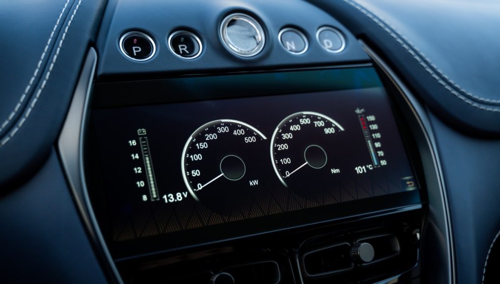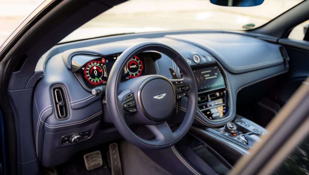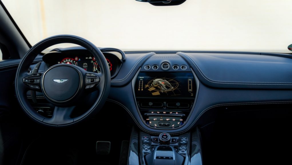Al igual que el exterior, el interior del DBX707 presenta un acabado cromado oscuro en los interruptores, que pueden combinarse a la perfección con el cromo brillante y la fibra de carbono de forma opcional. Las molduras en negro piano son un estándar, dejando como alternativa opcional los acabados en fibra de carbono o malla metálica de bronce.
