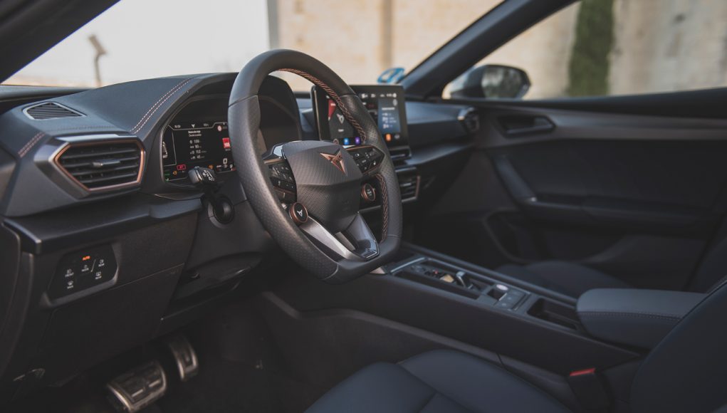 Hablando del volante, dispone de un grosor y tamaño perfectos con la parte inferior achatada, lo que se traduce en una única utilidad, facilitar la entrada ay salida del coche. Además de ser multifunción, dispone de un botón para poner en marcha el motor, así como de un mando que nos permite escoger entre los diferentes modos de conducción o para acceder directamente al modo CUPRA. Tras este encontramos el cuadro de mandos totalmente digitalizado y representado en una pantalla de 10” que es totalmente personalizable que hace recordar en alguna de sus representaciones a los modelos RS de Audi, por aquello de mostrar el cuenta revoluciones en posición central.