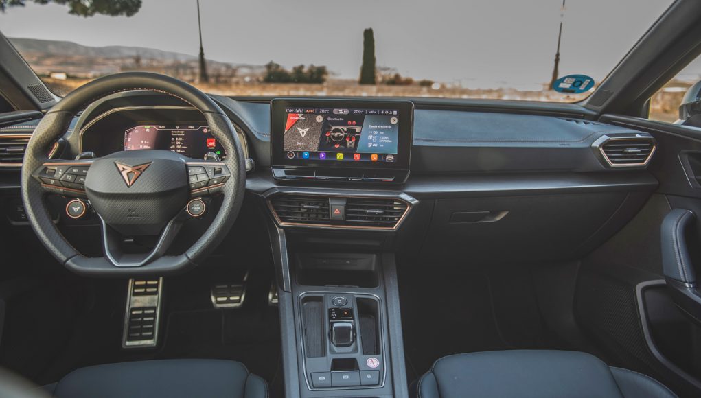 El habitáculo de los modelos de CUPRA es básicamente el mismo, es decir, encontramos lo mismo en un Formentor que en un León, respirando en ambos modelos un ambiente premium acompañado de un aire deportivo, pero sobre todo tecnológico, que en ambos modelos viene dado por la nueva pantalla de 12” táctil. Esta pantalla aglutina básicamente el funcionamiento del sistema de infoentretenimiento, así como diversos parámetros de configuración del coche o el sistema de climatización, entre otras muchas funciones. Concentrarlo todo tiene una ventaja, y es que el resto del salpicadero queda libre de muchos botones, que, en el caso del León, encontramos solamente al lado izquierdo del volante para el sistema de iluminación exterior. Pero, por otro lado, tiene la desventaja, de que tienes que aprenderte de memoria donde está cada una de las funciones del coche, lo que lleva su tiempo. Este sistema cuenta también con conectividad sin cable, con Android Auto, Apple CarPlay y MirrorLink, lo que supone una integración total con cualquier smartphone de última generación.