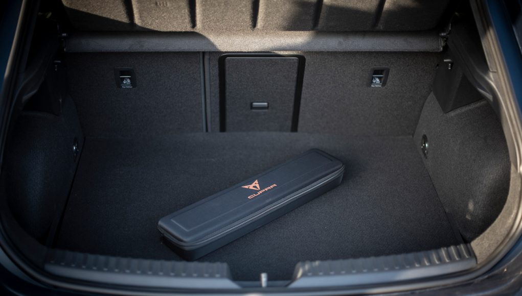 Las baterías, están situadas en el piso del maletero, de ahí que resten litros de capacidad y son las encargadas de alimentar el sistema eléctrico que es de 13 kWh. Estas pueden cargarse en menos de 6 horas en un enchufe convencional doméstico, y en menos de 3 horas y 45 minutos en un cargador de 3,6 kW de corriente alterna, que puede conectarse al coche mediante el puerto de carga ubicado en la aleta delantera izquierda. Gracias a este esquema, el CUPRA León e-Hybrid recibe la etiqueta CERO de la DGT con todos los beneficios que lleva asociado.