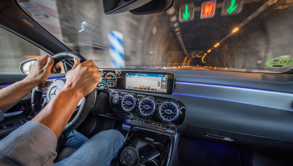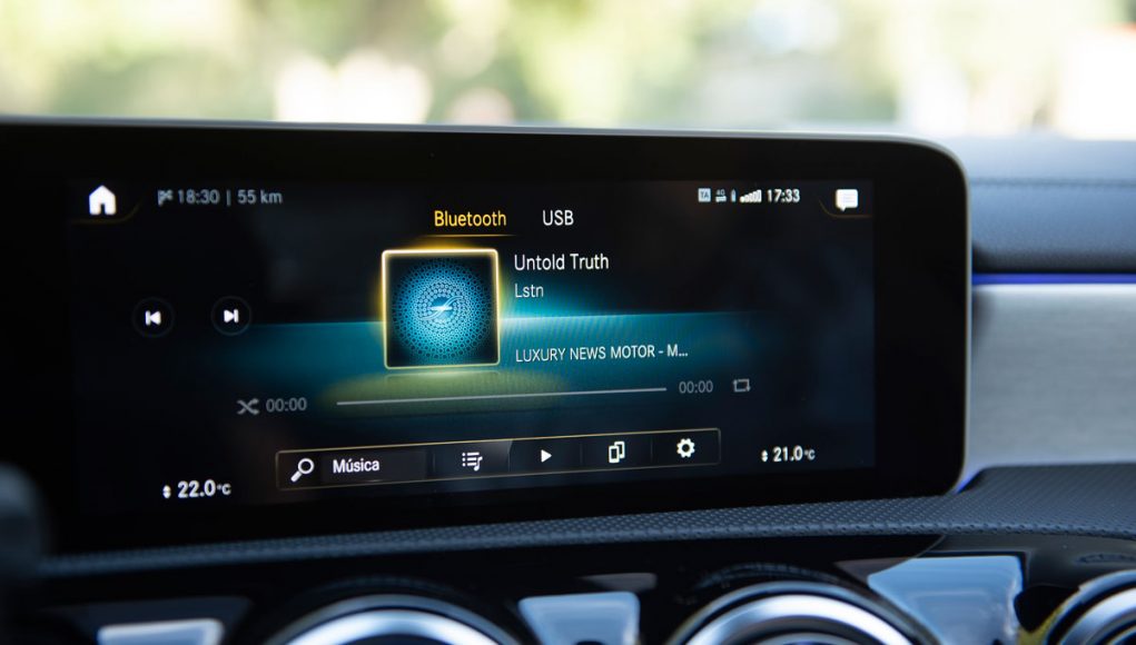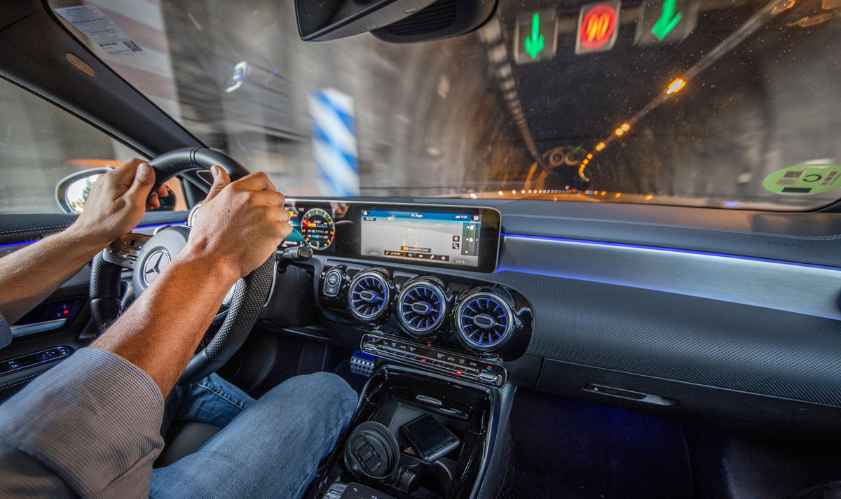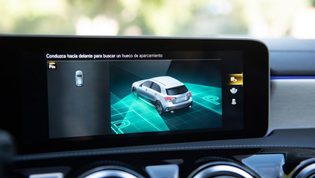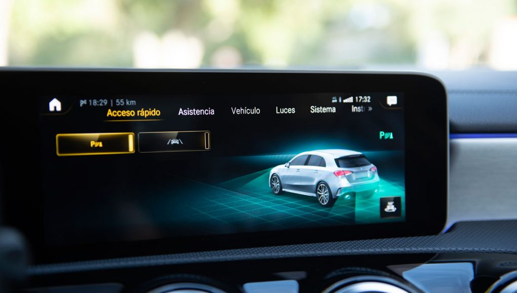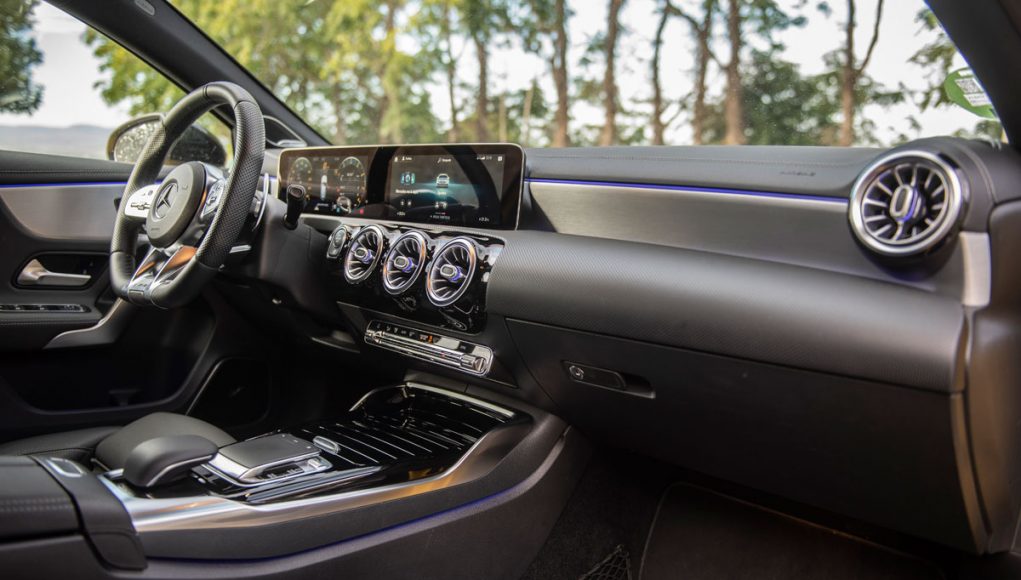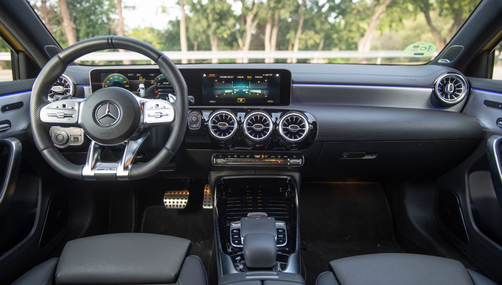 Al pasar al interior del AMG A 35 nos encontramos con un Clase A tope de gama con algunos adornos racing. Las modificaciones no son exageradas pero tampoco es el objetivo en este tipo de modelos, que ya cuentan con el arsenal tecnológico de ser un equipamiento superior. El ajuste de los precios de Mercedes supone el uso de materiales de peor calidad, hay mucho plástico duro y algunas piezas no encajan todo lo bien que deberían. Lo solucionan con molduras bien diseñadas, mucha superficie acolchada y el ‘piano black’, que considero han usado en demasía.