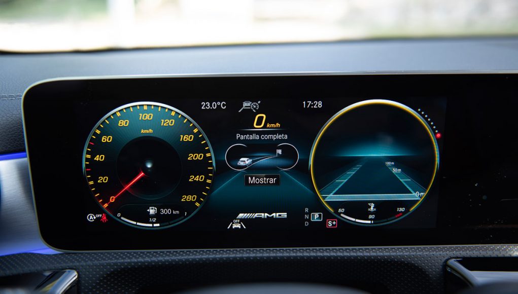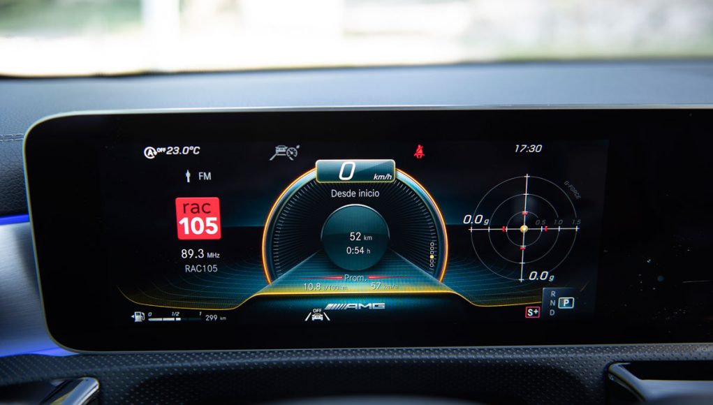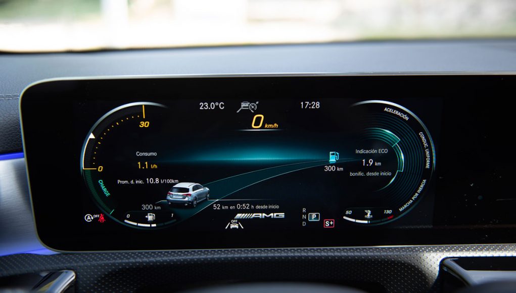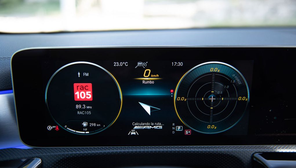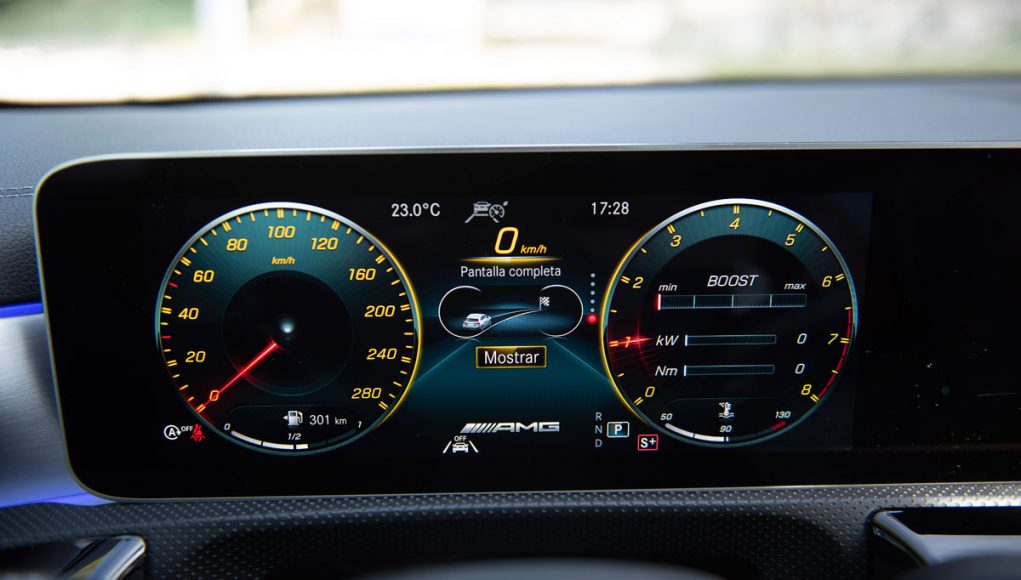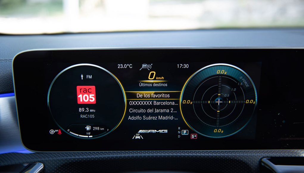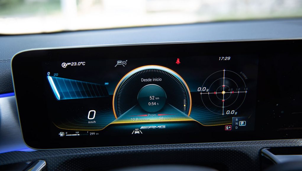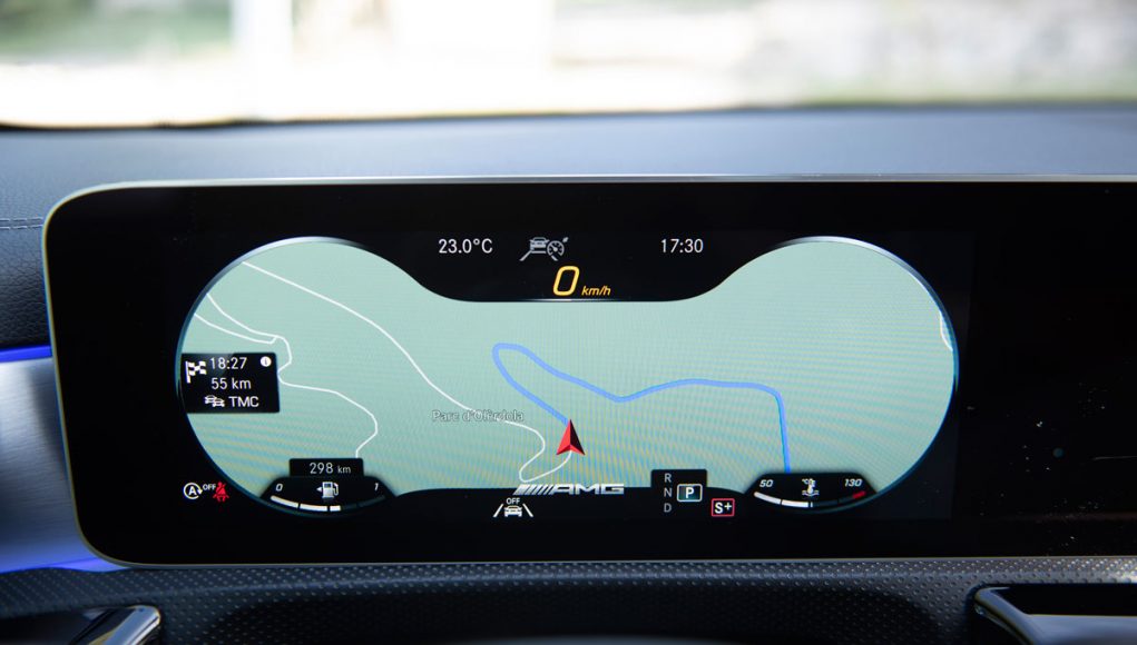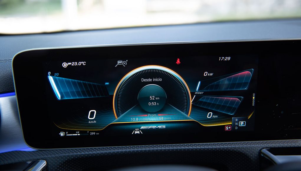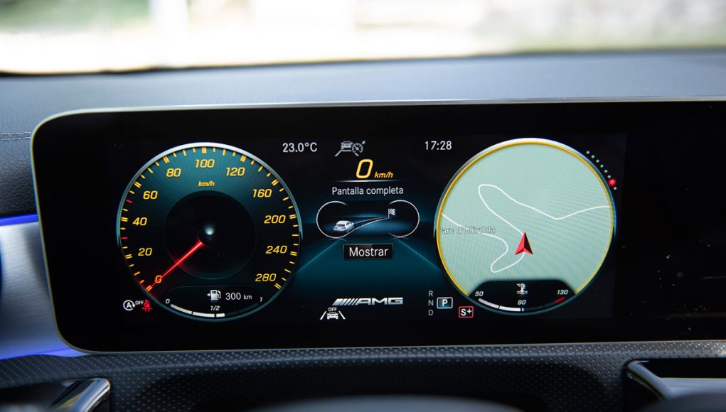 Elementos como los asientos, el volante multifunción y la doble pantalla del sistema MBUX se pueden encontrar en acabados AMG del propio Clase A. Estamos ante un modelo con ligeros retoques en el interior, como puede ser que la pantalla de instrumentación que cuenta con menús específicos AMG, pero poco más. Los asientos son bastante estrechos así que para una persona de tamaño considerable pueden ser incómodos pero para una persona media el agarre es bastante bueno.
