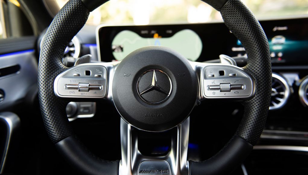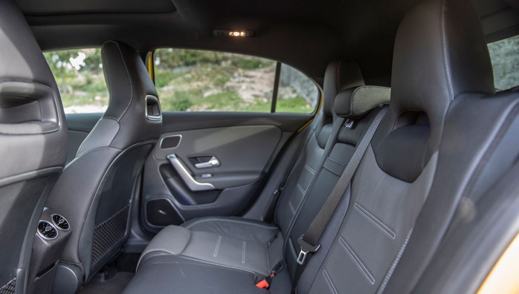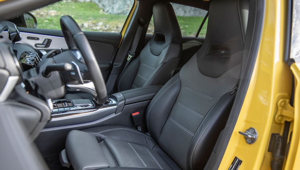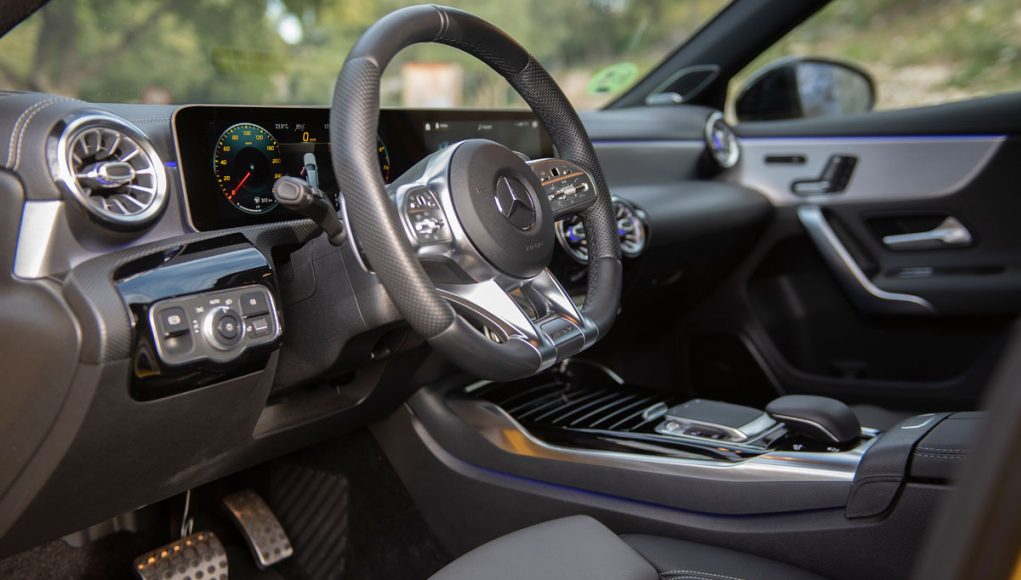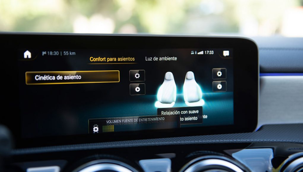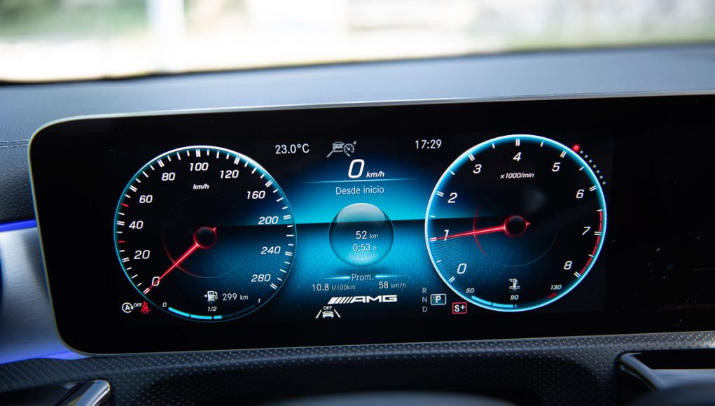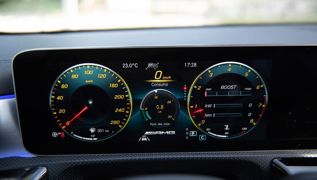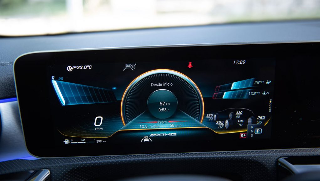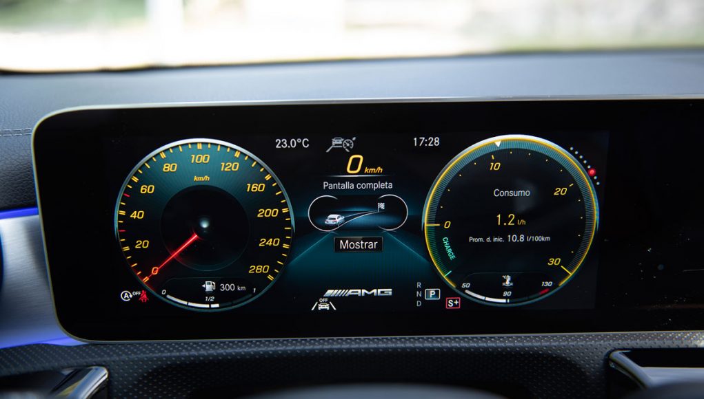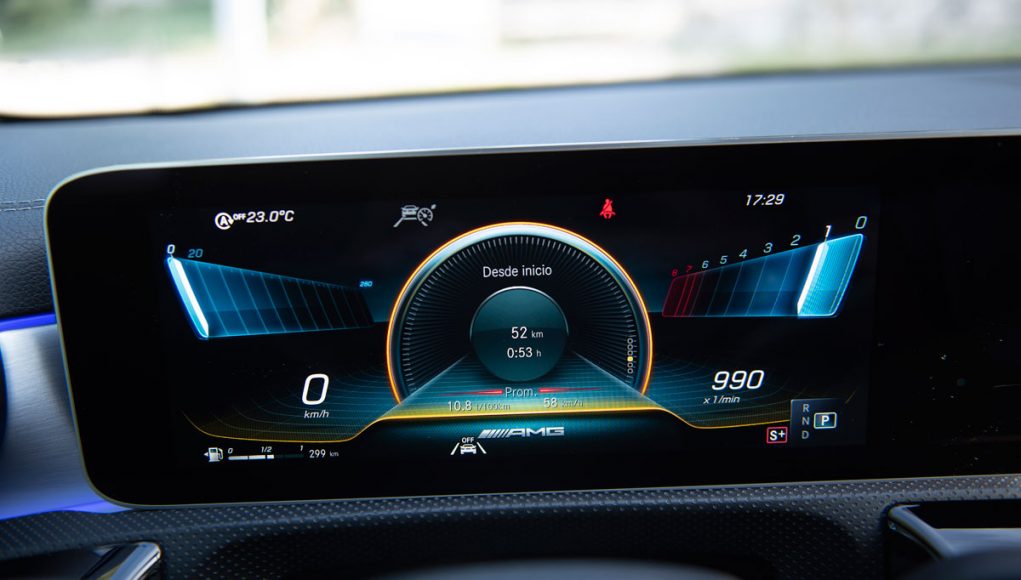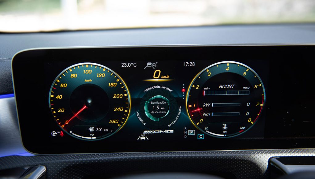 Elementos como los asientos, el volante multifunción y la doble pantalla del sistema MBUX se pueden encontrar en acabados AMG del propio Clase A. Estamos ante un modelo con ligeros retoques en el interior, como puede ser que la pantalla de instrumentación que cuenta con menús específicos AMG, pero poco más. Los asientos son bastante estrechos así que para una persona de tamaño considerable pueden ser incómodos pero para una persona media el agarre es bastante bueno.