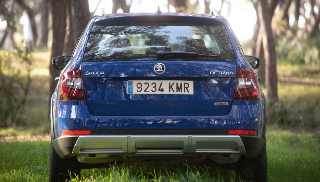 El Skoda Octavia Scout se diferencia del modelo del que deriva por los detalles camperos de la carrocería. A simple vista podemos ver los protectores plásticos que recorren los bajos del coche además de las inserciones color plata del frontal y el difusor. Los grupos ópticos con tecnología Full LED siguen la línea marcada por el Octavia. Para gustos colores pero, personalmente, no me parece un acierto este retoque estético, mientras que los detalles metalizados le aportan el toque todoterreno indicado para esta versión.
