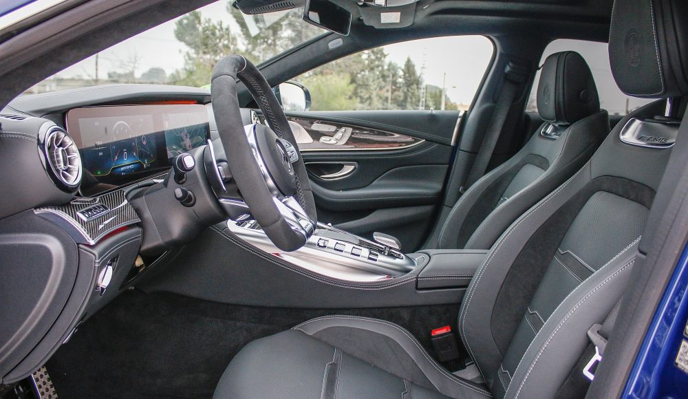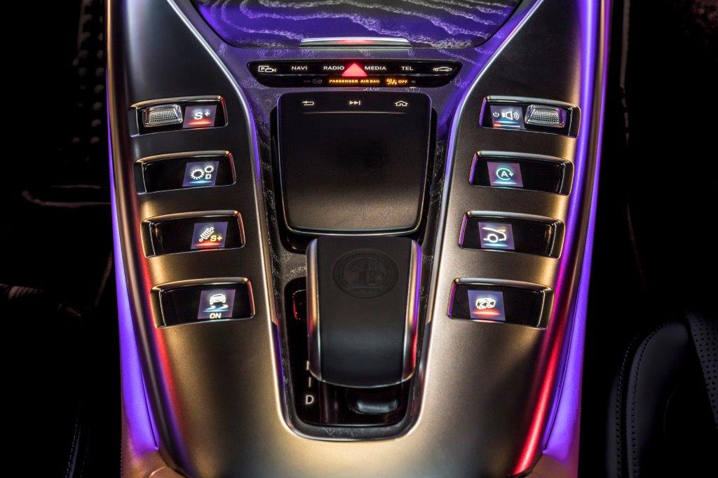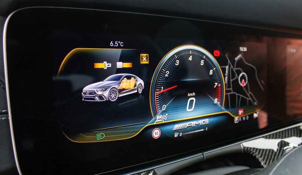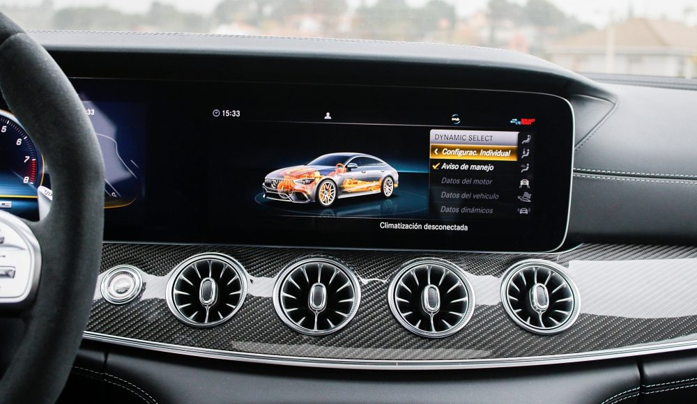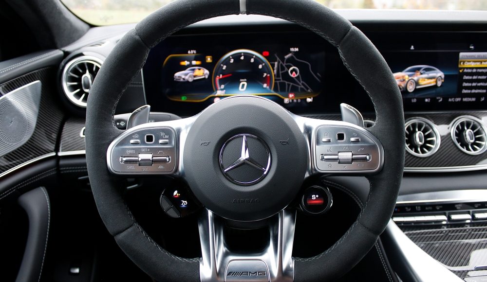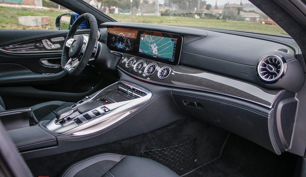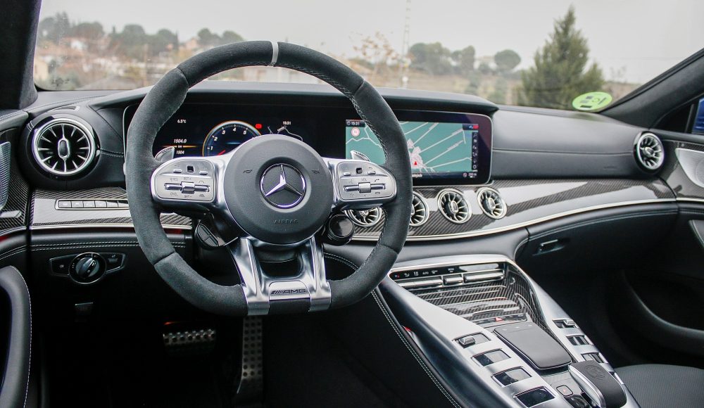 Como ya es habitual en las berlinas de Mercedes-AMG, el habitáculo ofrece una perfecta simbiosis entre el lujo, la tecnología y la deportividad, aunando cada uno de estos elementos de una forma única. En la consola central, encontramos la misma disposición de los mandos que podemos encontrar en el AMG GT de 2 puertas y 2 plazas, pero en este caso, con una nueva botonera que recurre al uso del LCD, mientras que el cuadro de mandos está formado por dos pantallas completamente digitales de 12,3 pulgadas, siendo la de la derecha táctil.