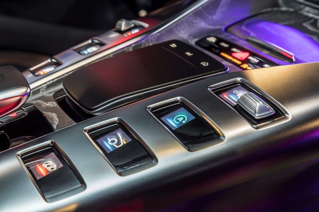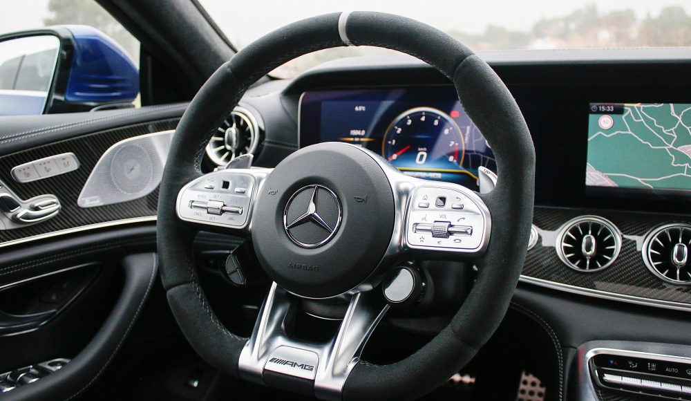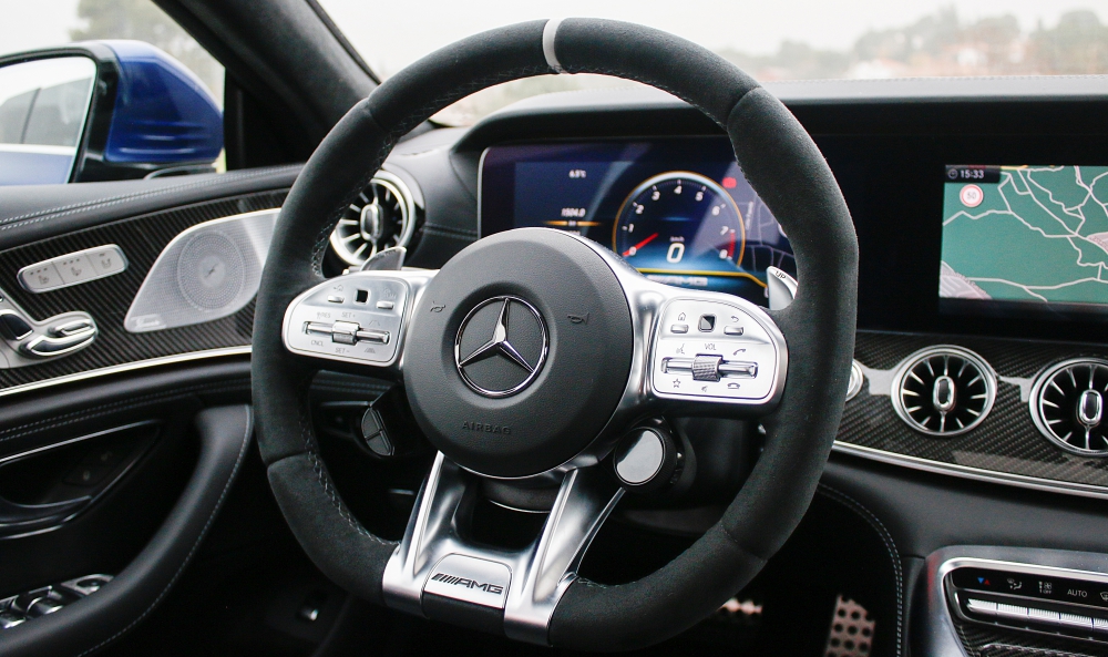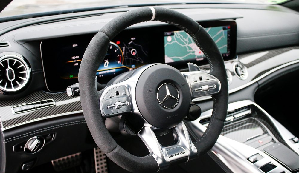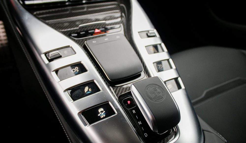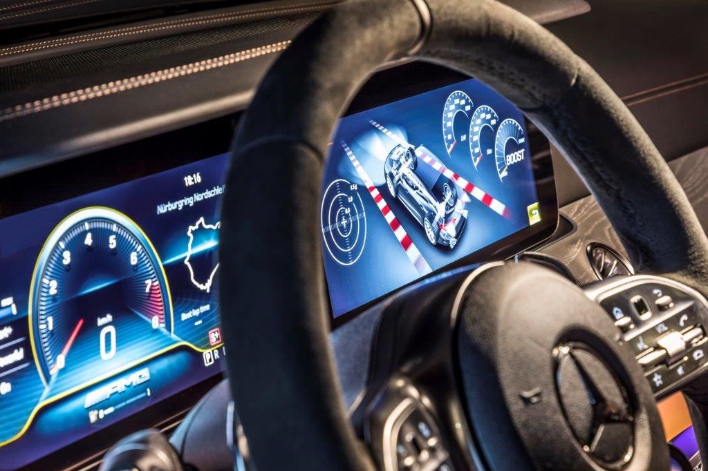 Como ya es habitual en las berlinas de Mercedes-AMG, el habitáculo ofrece una perfecta simbiosis entre el lujo, la tecnología y la deportividad, aunando cada uno de estos elementos de una forma única. En la consola central, encontramos la misma disposición de los mandos que podemos encontrar en el AMG GT de 2 puertas y 2 plazas, pero en este caso, con una nueva botonera que recurre al uso del LCD, mientras que el cuadro de mandos está formado por dos pantallas completamente digitales de 12,3 pulgadas, siendo la de la derecha táctil.