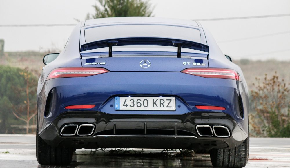 La zaga presenta su propio carácter, aunque utiliza la misma línea de diseño para los pilotos que el resto de la gama GT, entre los que se encuentra el portón trasero que pasa totalmente desapercibido como tal, y del que emerge un alerón para ofrecer carga aerodinámica a esta parte del coche. En la parte más baja, el difusor separa las dobles salidas de escape de forma trapezoidal por las que brama el potente rugido del V8.