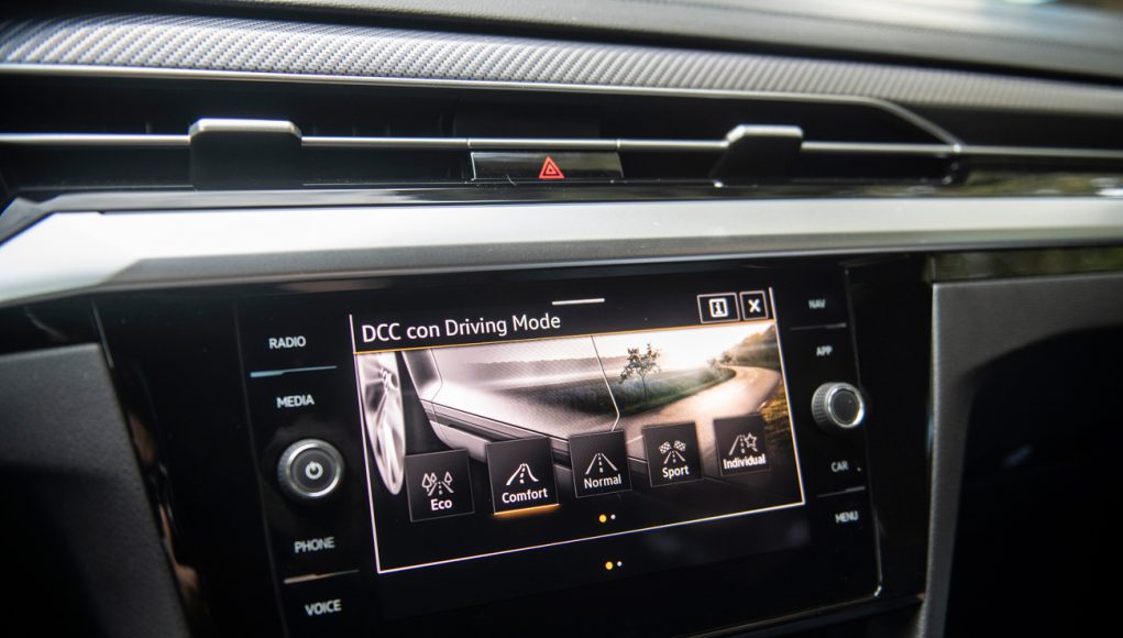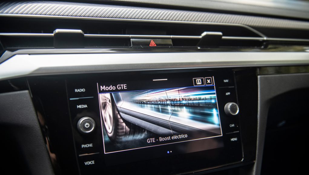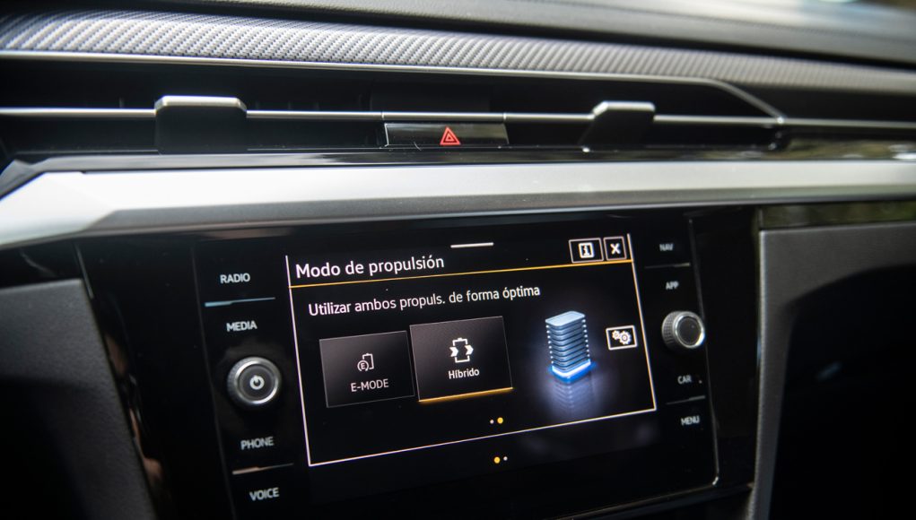 Para sacar el mejor de los provechos de la parte mecánica, este Arteon dispone de 5 modos de conducción (Eco, Comfort, Normal, Sport e Individual), además de dos modos específicos para la conducción eléctrica que son el E-MODE (totalmente eléctrico) y el Híbrido (el coche gestiona la conducción entre el motor de combustión y el modo eléctrico), así como un tercero denominado GTE (hace de Boost eléctrico) que emplea el 100% de la potencia de ambos sistemas de propulsión. Además, encontramos también el modo B, que se selecciona a través del selector del cambio DSG con el que se activa un sistema de retención mediante la frenada regenerativa que, aunque no permite circular con un solo pedal como otros híbridos o eléctricos aumenta la eficiencia de todo el conjunto.