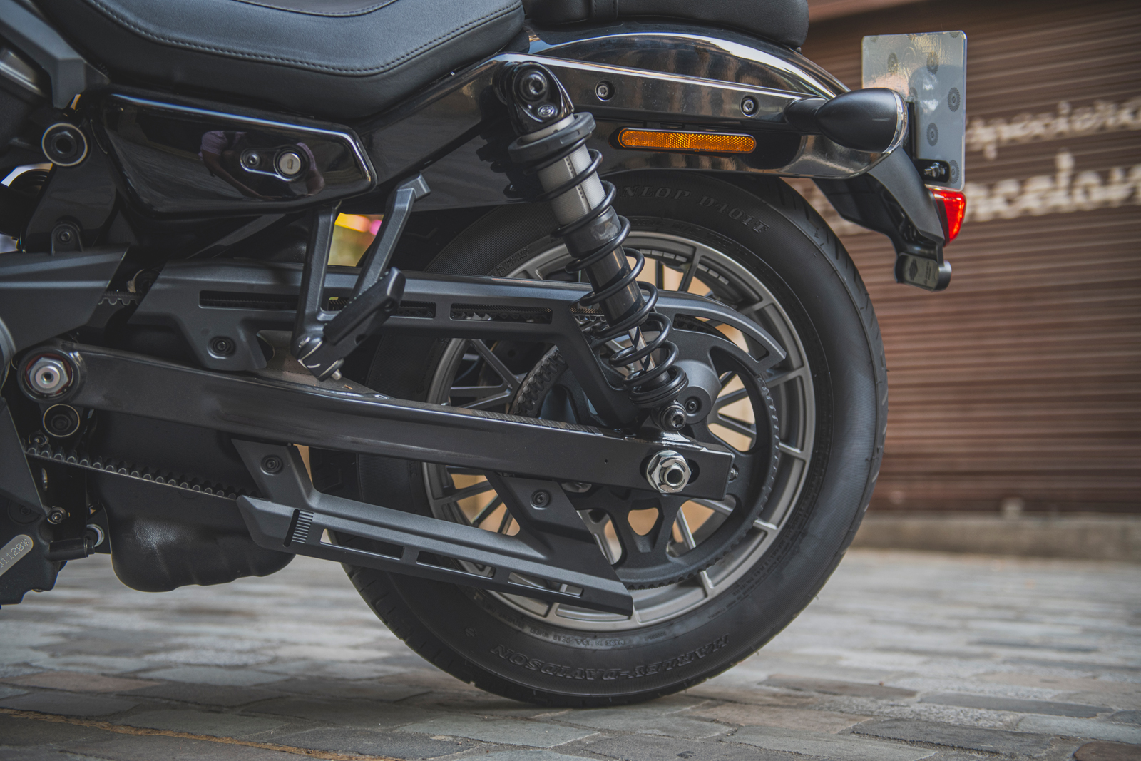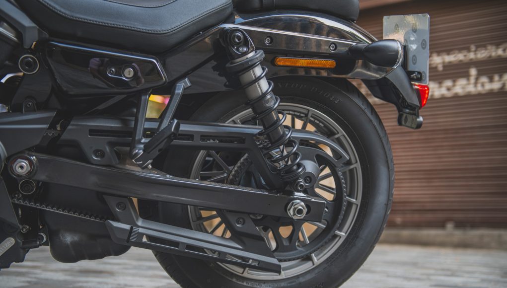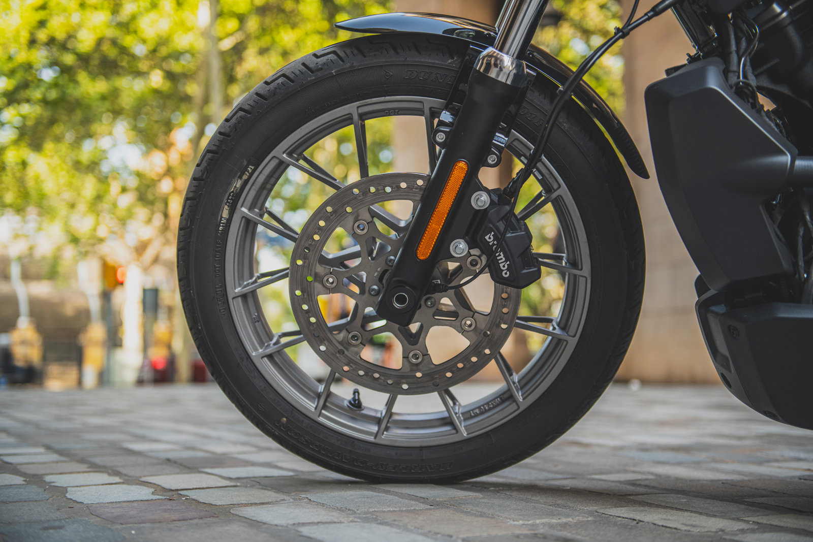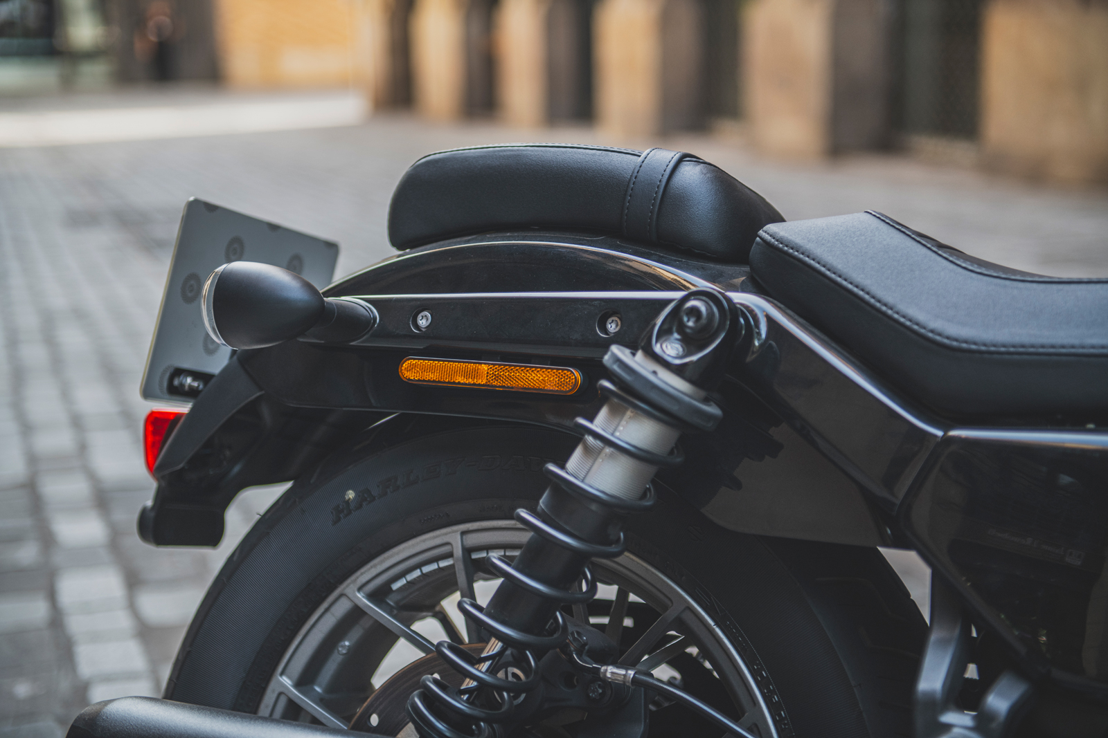 Con respecto a la Sportster S se ha aumentado 76mm el recorrido de la rueda situando ahora el asiento a 698mm del suelo, lo que facilita mucho no solo el acceso a la moto sino también las maniobras en parado, pero esto penaliza la colocación de los estribos que quedan muy bajos con respecto al suelo, lo que se traduce en que a la hora de abordar curvas en muchas ocasiones rozan. Por su parte, la horquilla delantera dispone de un recorrido de 114 mm, suficiente para engullir lo que encontremos en el asfalto.
